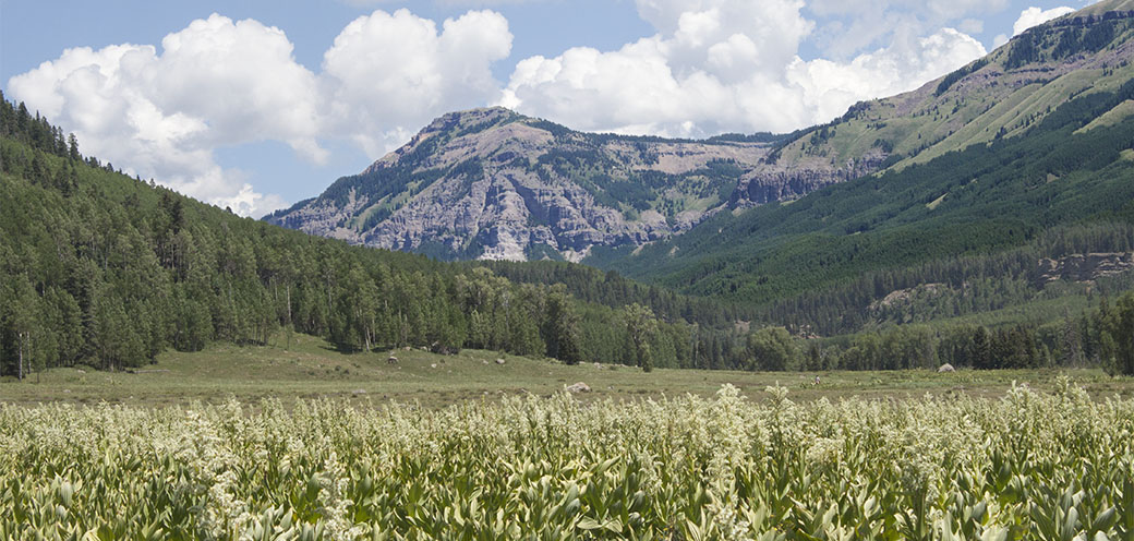 To my right, the river snakes its way between the mountainside and the meadows, appearing and disappearing among thick clusters of willow and cottonwood, and a dense lower story of shrubs. On my left, a flowery meadow eases up the hillside to meet the edge of the forest, in a clear but softly undulating boundary. Straight ahead the valley narrows in the distance between two mountain ridges that form a large cradle. Framed behind them is a majestic peak that spreads its arms in a huge embrace with a blue bowl of sky and a few ornamental clouds mirroring the expanse of meadow below. It’s an incredible sight!
